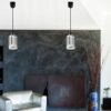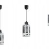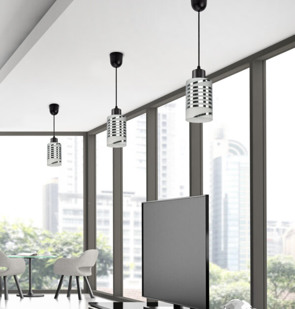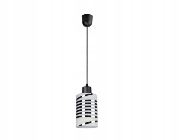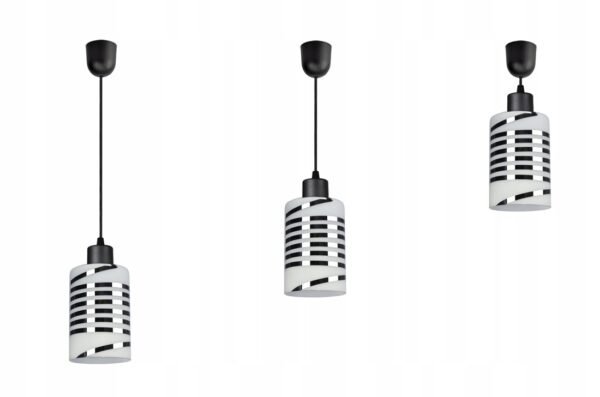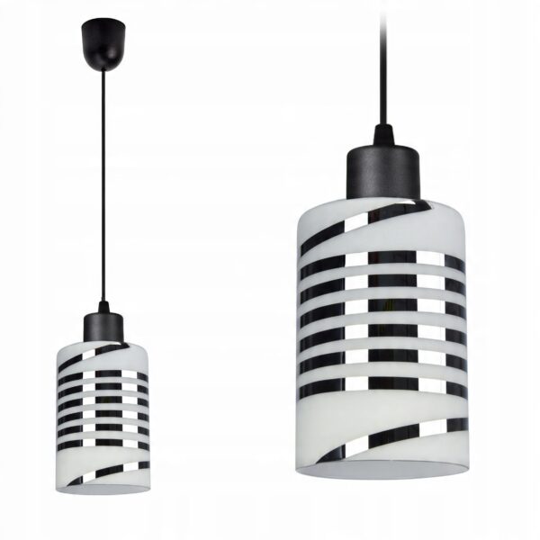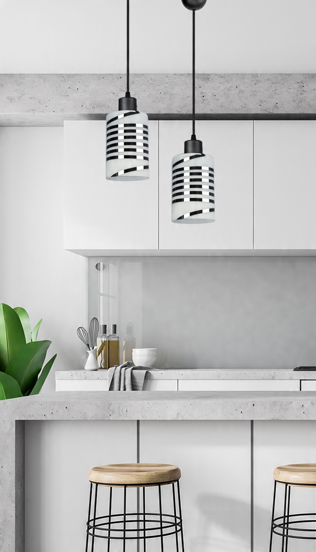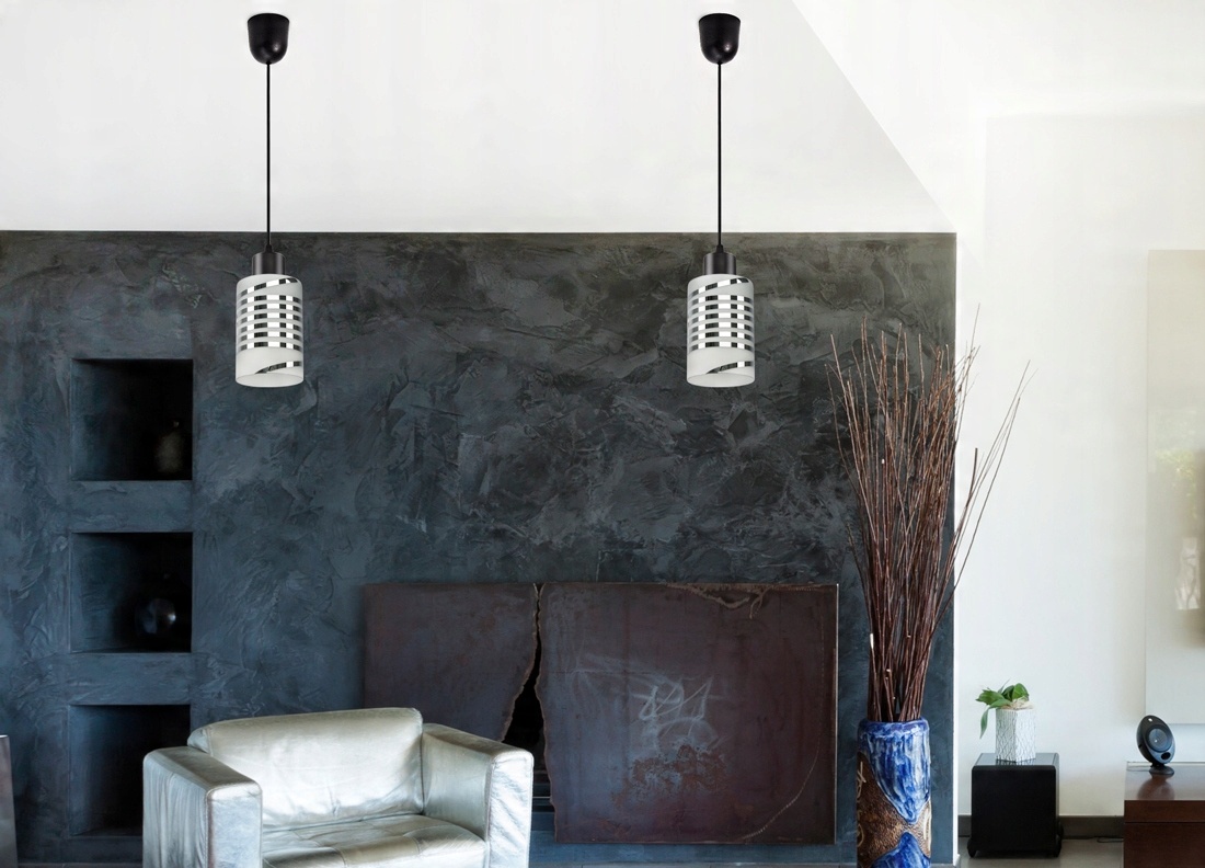 Praktyczna i nowoczesna lampa wisząca wyposażona w szklany klosz zdobiony chromowanymi pasami.