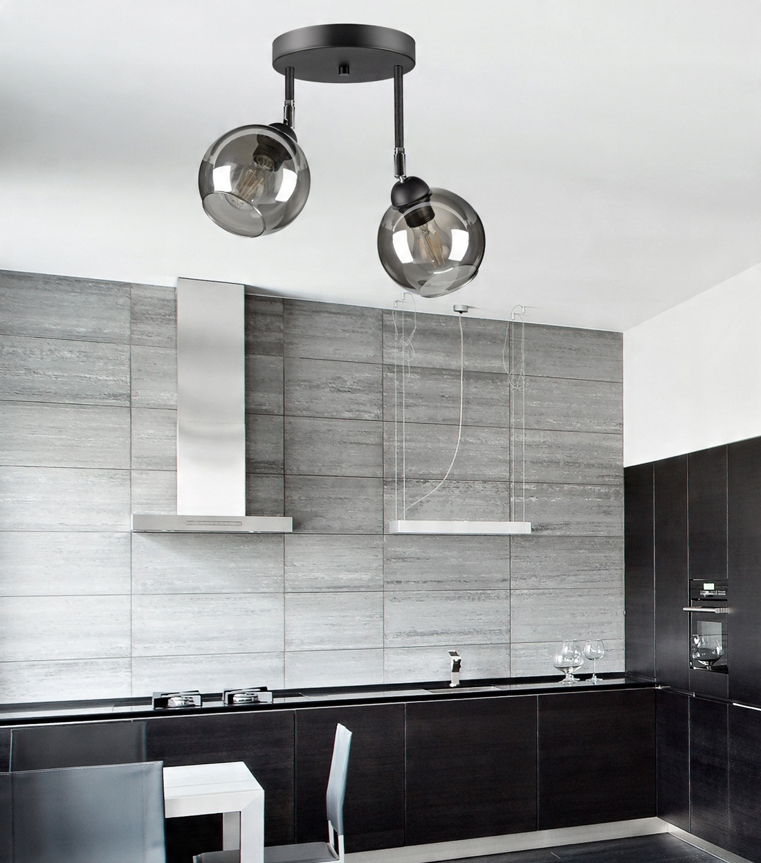 Nowoczesna lampa wisząca wyposażona w dwa szklane klosze dostępne do wyboru w różnych kolorach.